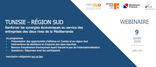 Découvrir les opportunités, comprendre les réformes en cours et analyser les atouts compétitifs de la Tunisie et de la région Sud Provence-Alpes-Côte d’Azur : tels sont les objectifs du webinaire « Tunisie – Région Sud : Renforcer les synergies économiques au service des entreprises des deux rives de la Méditerranée », co‑organisé par la FIPA-Tunisia, risingSUD et Business France Tunisie.