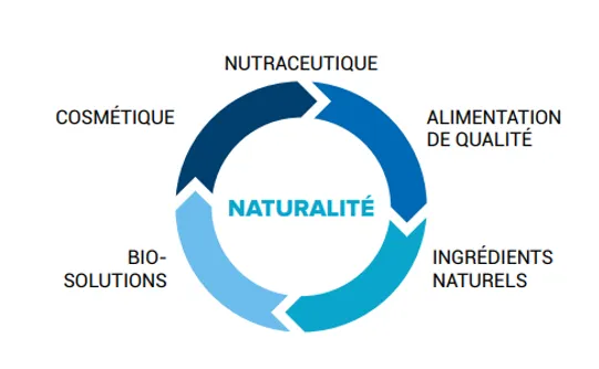 positionné sur 4 filières industrielles (Alimentation, Cosmétique, Ingrédients santé et Compléments alimentaires, Parfums et arômes). Il est composé de plus de 400 adhérents, représente 545 M€ d’investissements en R&D et a engagé un travail de définition de la Naturalité avec l’ensemble de l’écosystème